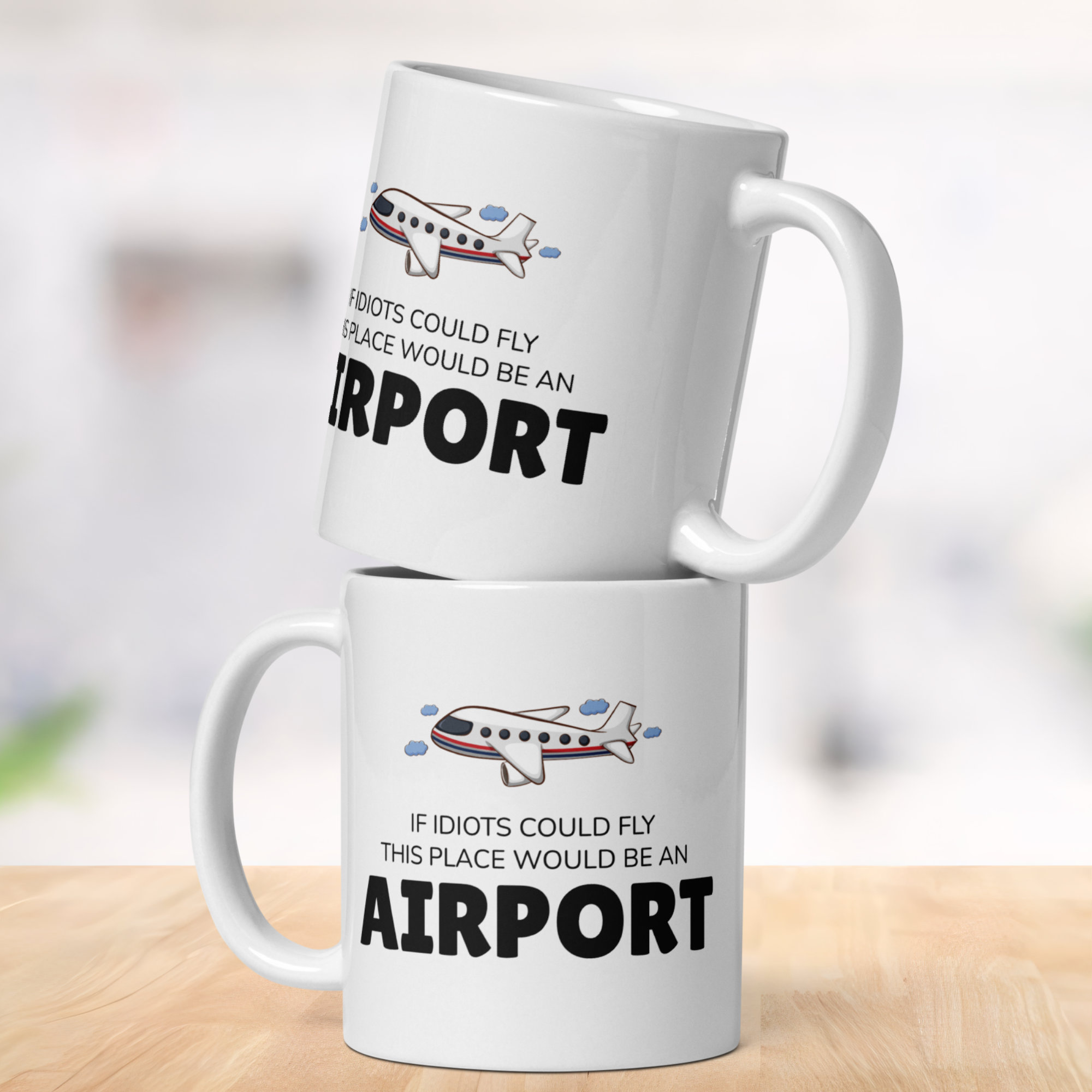 A rude and funny mug with ‘If idiots could fly this place would be an airport’ printed on both sides. This mug is a great rude and funny gift for any occasion.