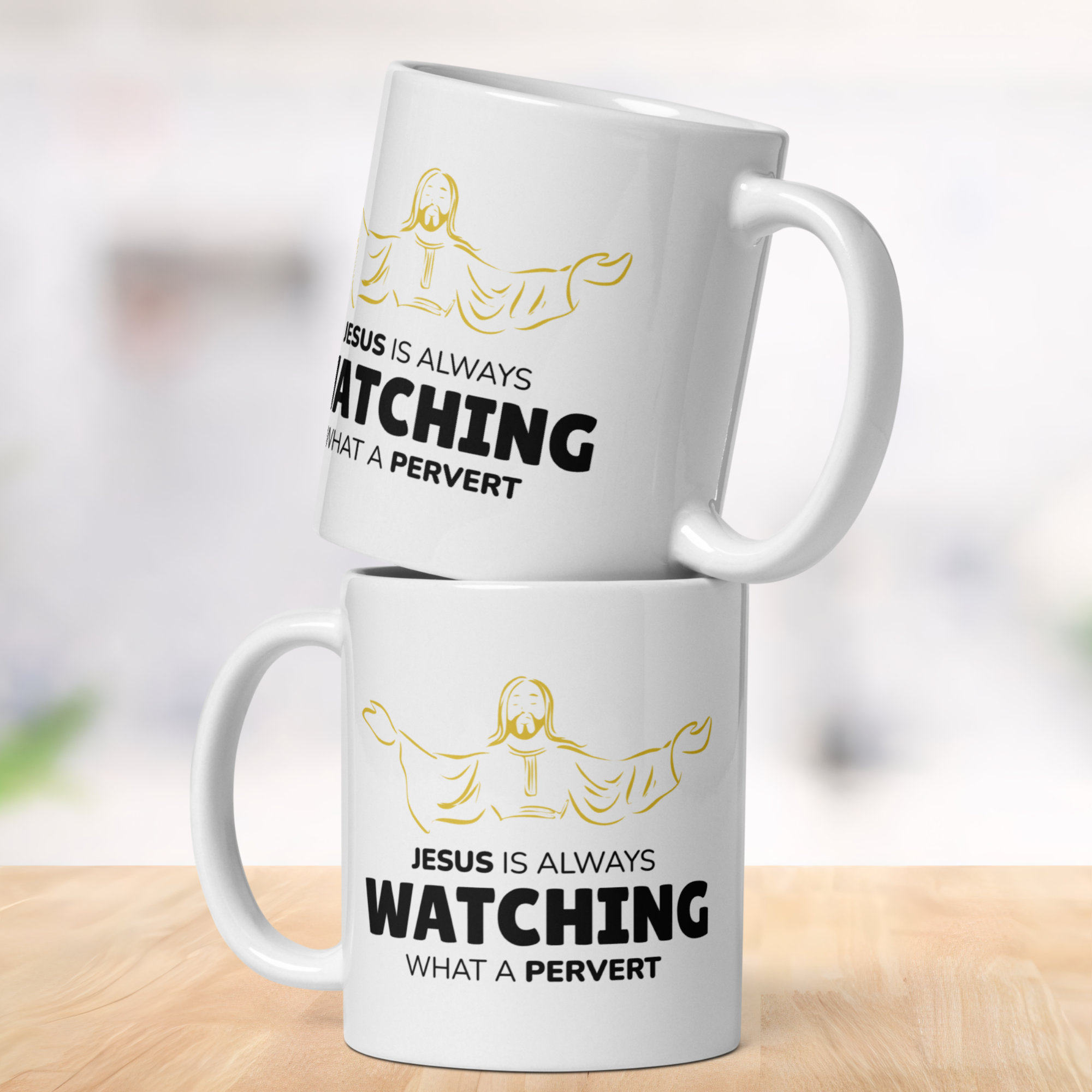 A rude and funny mug with ‘Jesus is always watching what a pervert’ printed on both sides. This mug is a great rude and funny gift for any occasion.