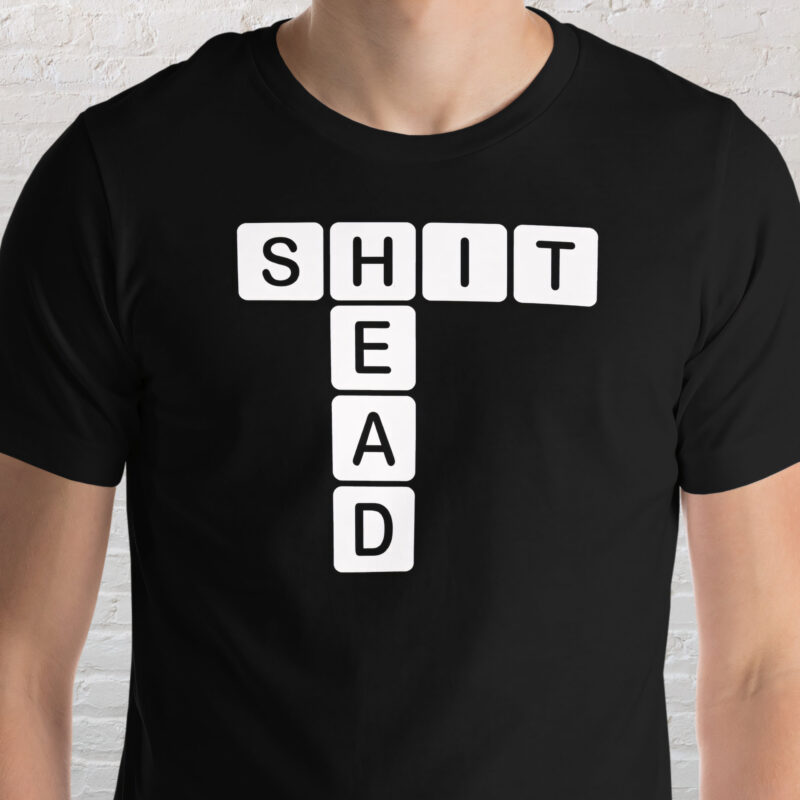 This rude and funny Crossword puzzle design features the words “Shit” and “Head”. A great way to insult a crossword-loving or scrabble-playing friend or family member.